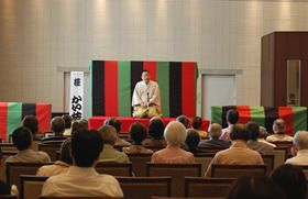 世界の人たちにも落語の魅力を届けたいと、“英語落語”の公演を行っておられ、この日も「Zoo(動物園)」を披露してくださいました。 簡単な英語表現を使っておられることと、高座いっぱいに動き回るパフォーマンスとでとても分かりやすく、会場では笑い声が絶えませんでした。古典落語「手水廻し」では、言葉の勘違いで起こる一連の騒動に、皆様手を叩いて笑っていらっしゃいました。