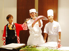 ご用意したのは、函館で水揚げされた重さ19kgのクロマグロ。皆様に召し上がっていただくべく、和食調理師が張り切って解体しました。