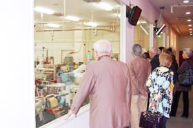 最後に京都銘菓おたべの工場見学へ。製造工程を見学しながら、できたての生八橋を試食。