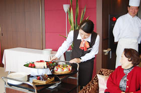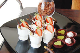 オペラ、フルーツタルト、苺のシャルロットのケーキ3種と、ホワイトチョコプリン、生チョコ、トリュフ、オレンジピールなど盛りだくさんのスイーツをビュッフェ形式でご提供しました。